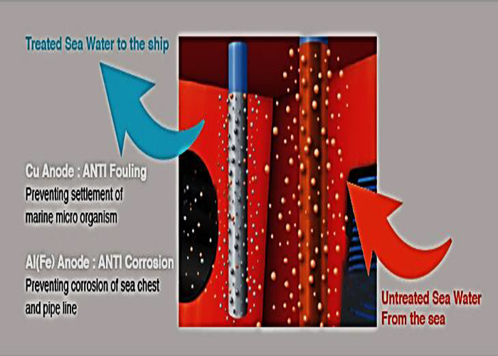 • The basic principle on which MGPS runs is electrolysis. The process involves usage of copper, aluminum and ferrous anodes. The anodes are normally fixed in pairs in the main sea chest or in such place where they are in the direction of the flow of water. The copper anode produces ions, which are carried away by water into the piping and machinery system which are enough to prevent marine life from settling. Due to the impressed current, the aluminum/ferrous anode produces ions, which spread over the system and produce a anti corrosive film over the pipelines, heat exchanger, valves, refrigeration and A/C unit etc, internally.